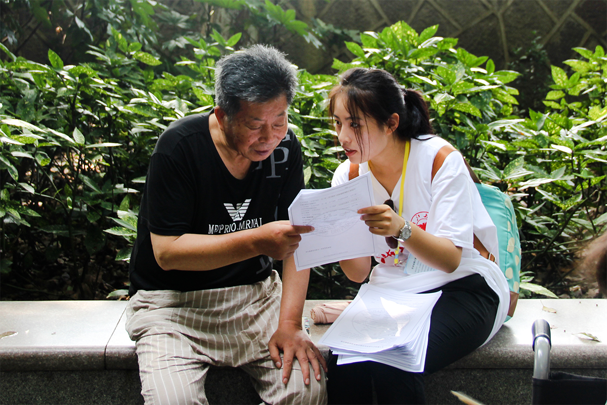 调研过程中,队员们主动与老人拉家常,倾听老人诉说,打消老人顾虑。大部分老人不识字或老花,队员们便一字一句念给老人听,从老人的回复中寻找信息点填入问卷;对于老人疑虑之处,队员们详细解释,力图使老人在理解的基础上完成问卷,确保调研结果的准确性。