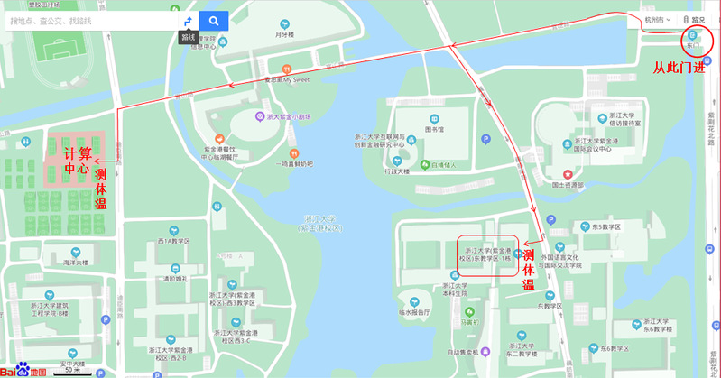 (一)沿规定路线行走。所有考生凭准考证、“亮码+测体温+戴口罩”,从浙江大学紫金港校区东大门(申花路口)进入,沿指定路线步行约10-15分钟至考场【所有考生不得开车(含出租车)进入校园】,考试结束原路返回离开学校,不得在校园内滞留。具体路线如下: