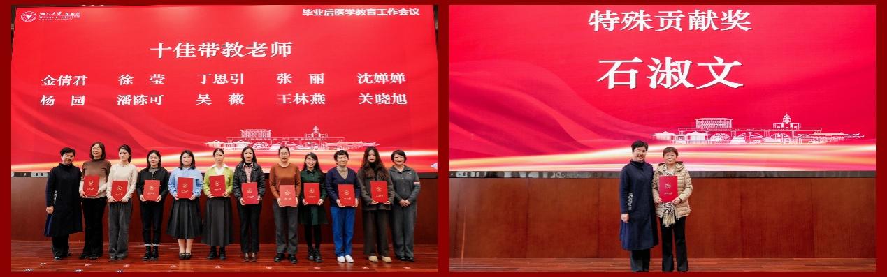 会议表彰了住院医师规范化培训2024年度“十佳专业基地”“十佳带教老师”和19名“优秀住院医师”,并为在2024年住院医师规范化培训结业理论考核和国家执业医师理论考试中通过率百分之百的培训基地颁发了“优秀组织奖”,为多年来在住院医师规范化培训工作中做出杰出贡献的石淑文老师颁发“特殊贡献奖”。